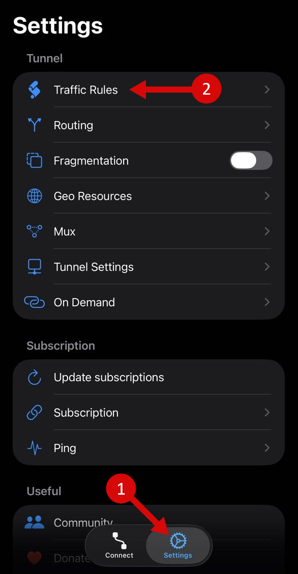 Открыть v2RayTun, перейти в раздел Settings (шестерёнка внизу), в блоке Туннель выбрать пункт Правила трафика