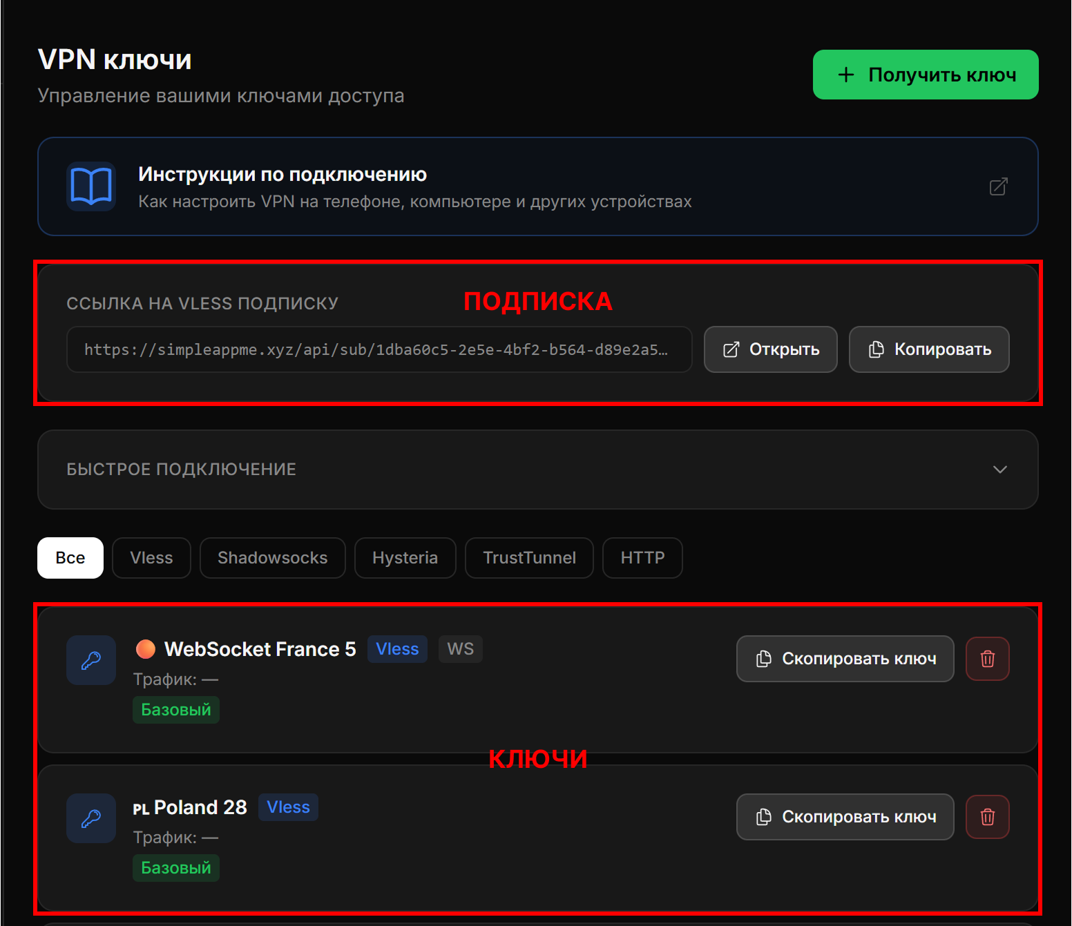 После получения ключа необходимо добавить ссылку на подписку в VPN-приложение. Есть два способа: