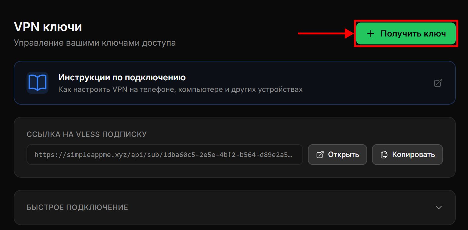 В разделе «Мои ключи» раскрыть блок «Быстрое подключение». В нём перечислены поддерживаемые VPN-приложения. Нажать кнопку «Открыть» напротив нужного приложения — подписка автоматически добавится в приложение.