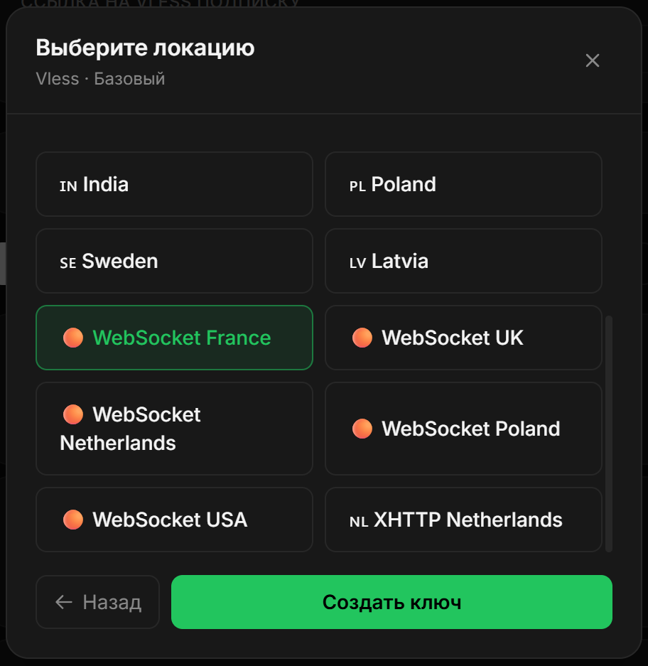 - Выбрать локацию (страну) сервера (например, WebSocket France) и нажать «Создать ключ»