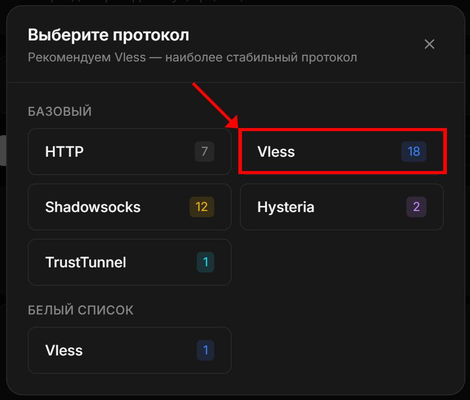 - Vless — рекомендуемый протокол. Стабильный и быстрый. При выборе локации рекомендуется выбирать серверы с пометкой WebSocket (например, WebSocket France, WebSocket UK) — это разновидность Vless с улучшенной стабильностью соединения